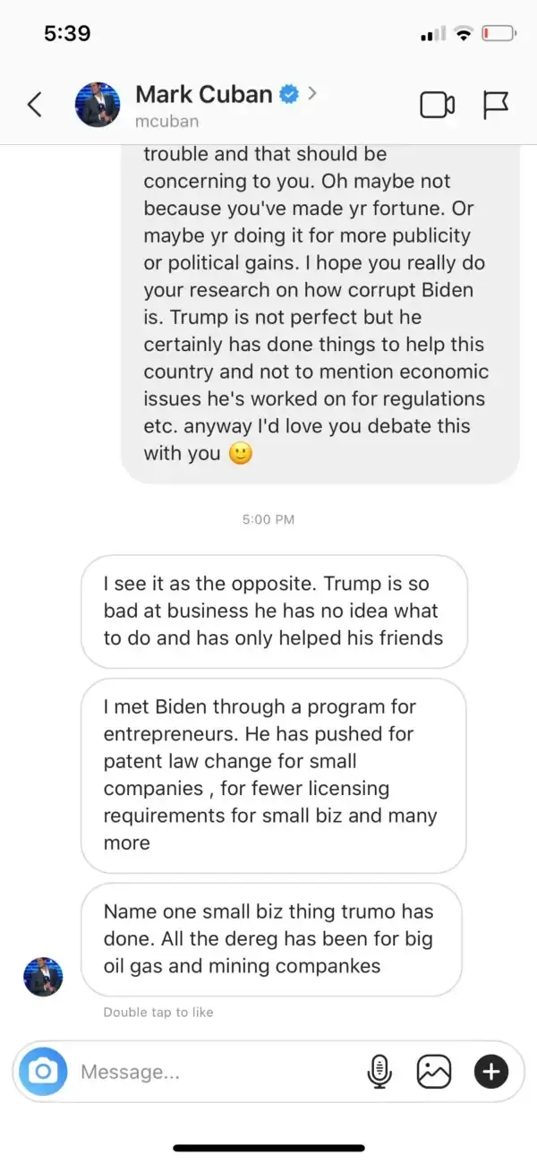 As they say, it goes down in the Instagram DM’s. Late on Sunday June 28th, 2020, billionaire CEO Mark Cuban engaged in a debate with a senior executive at The DeJesus Organization over small business advantages and disadvantages under the Trump administration. In a direct message to DeJesus, Mark Cuban states “Trump is so bad at business he has no idea what to do and has only helped his friends”.
